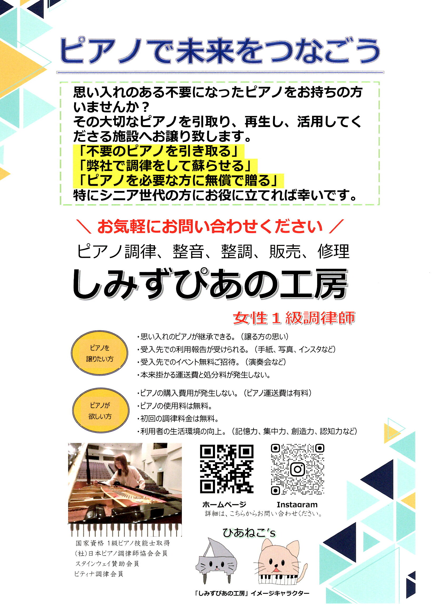 手放したい方から大切なピアノをお預かりし、必要としている施設へ橋渡しをする活動です。不要になったピアノを廃棄するのではなく、再利用することで、SDGsの観点からも社会貢献できるものと考えております。日本は世界でも特に高齢化が進んでいる国の一つです。私共は、高齢者の方々の人生の豊かさに、ピアノも貢献できると実感しております。施設の皆さまのお役に立てる機会があれば嬉しく思います。